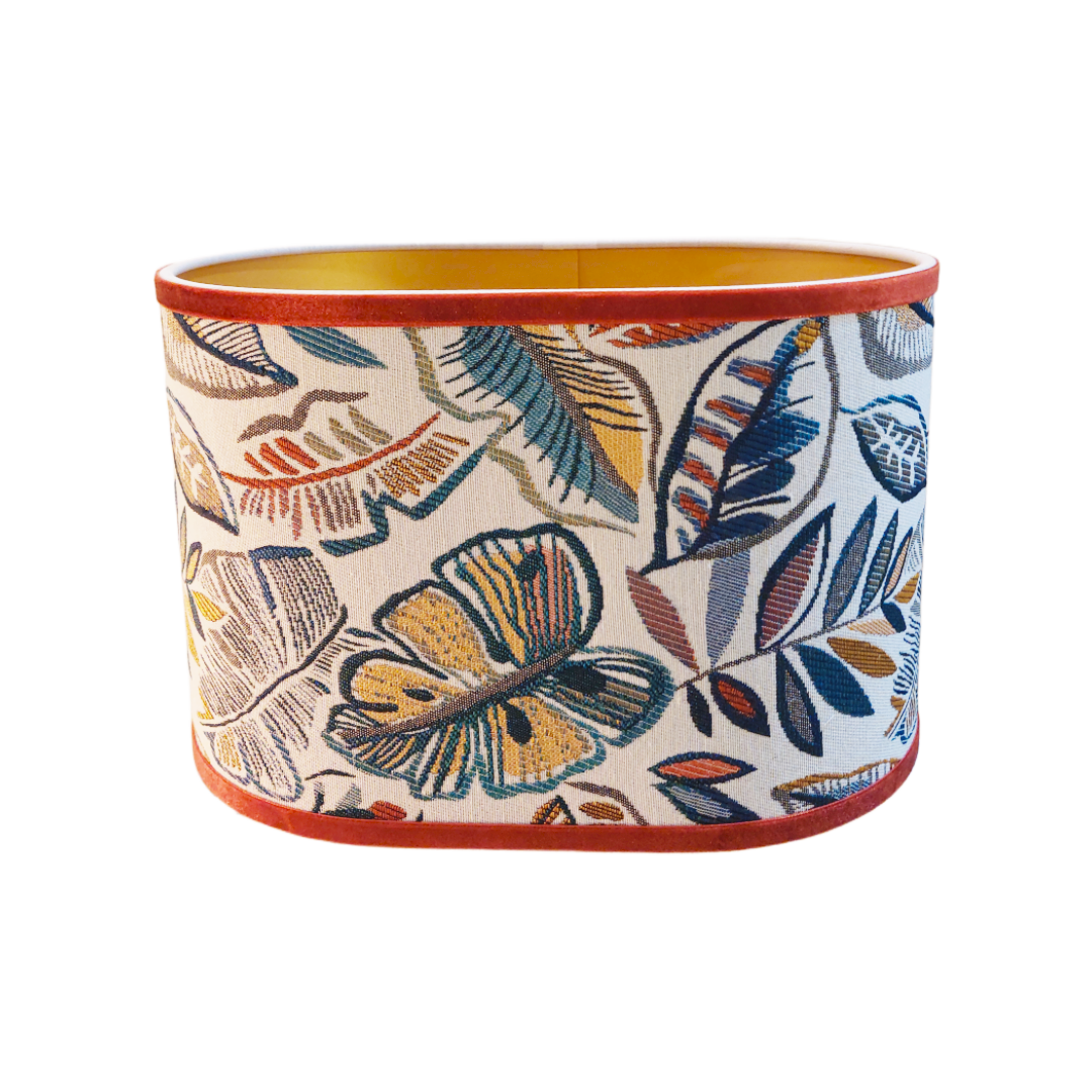 De Bologna lampenkap is een unieke en kleurvolle keuze die een direct exotische sfeer creëert. Het design bestaat uit diverse kleurrijke bladeren, met de dominante tinten Terra, Blauw en Wit. De kap is afgewerkt met een opvallend roest fluwelen bandje, wat de rijke en levendige uitstraling perfect accentueert.