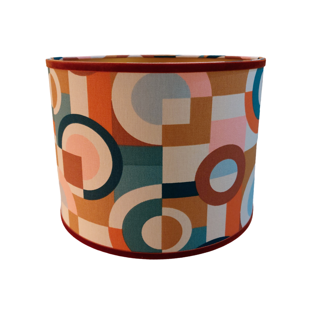 De Como lampenkap is een ware ode aan abstracte kunst. Het design heeft een uniek Picasso-achtige uitstraling, gekenmerkt door vlakken met rondjes in een levendige multikleur. Dit Cirkel/Blok patroon maakt de kap direct tot een uniek en minimalistisch statement en is afgewerkt met een contrasterend roest fluwelen bandje.