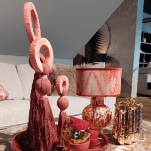 De Como lampenkap is een ware ode aan abstracte kunst. Het design heeft een uniek Picasso-achtige uitstraling, gekenmerkt door vlakken met rondjes in een levendige multikleur. Dit Cirkel/Blok patroon maakt de kap direct tot een uniek en minimalistisch statement en is afgewerkt met een contrasterend roest fluwelen bandje.