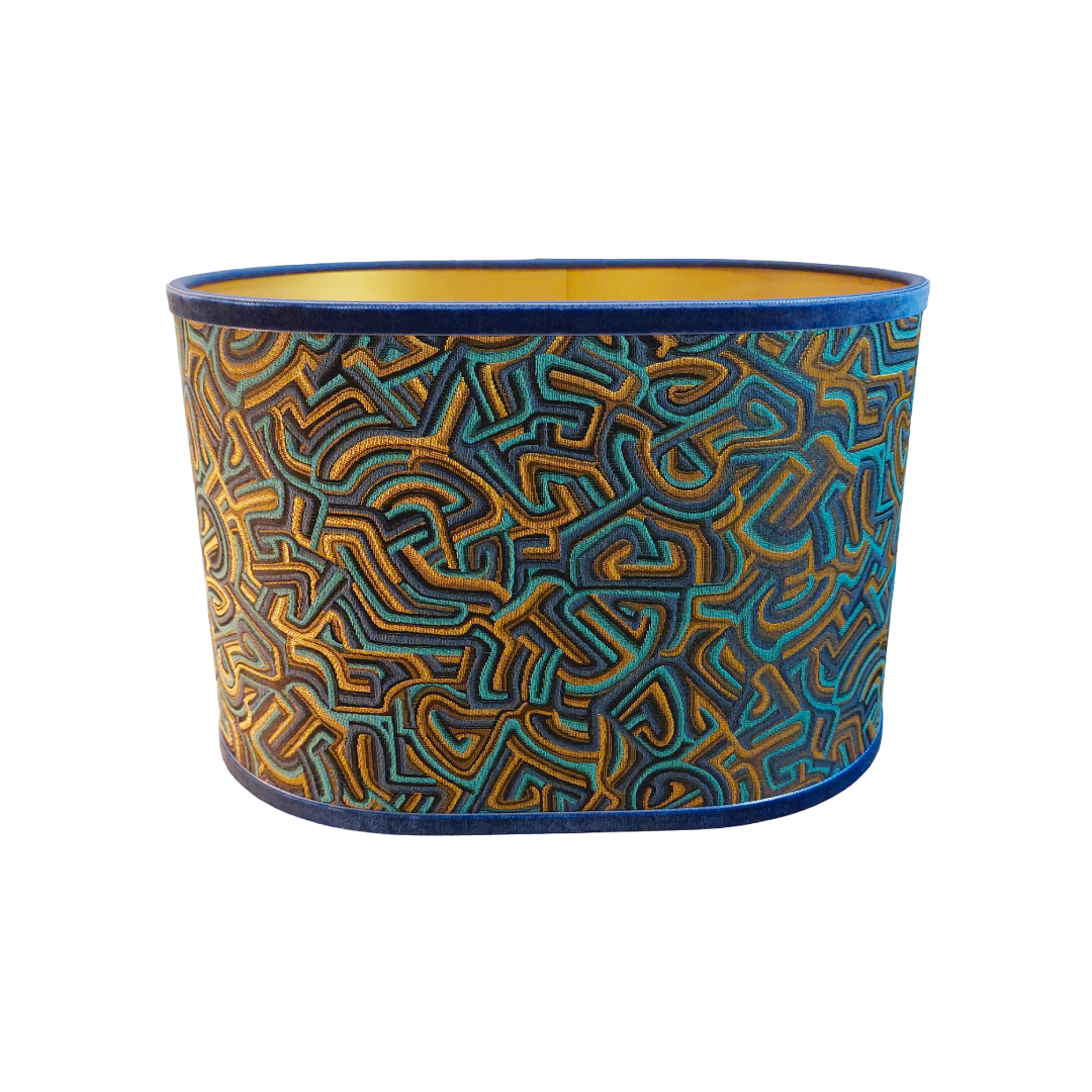 De Tropea lampenkap is de blauwe, mysterieuze variant in de ‘doolhof’-familie (familie van de Pucci). Deze lampenkap is een ware blikvanger met een intrigerend doolhof patroon in rijke, blauwachtige tinten: Aqua, Donkerblauw en glimmend Goud. Deze unieke, kleurvolle en exotische combinatie maakt de Tropea tot een statement piece in elk interieur. Het geheel wordt perfect afgerond door een elegant blauw fluwelen bandje.