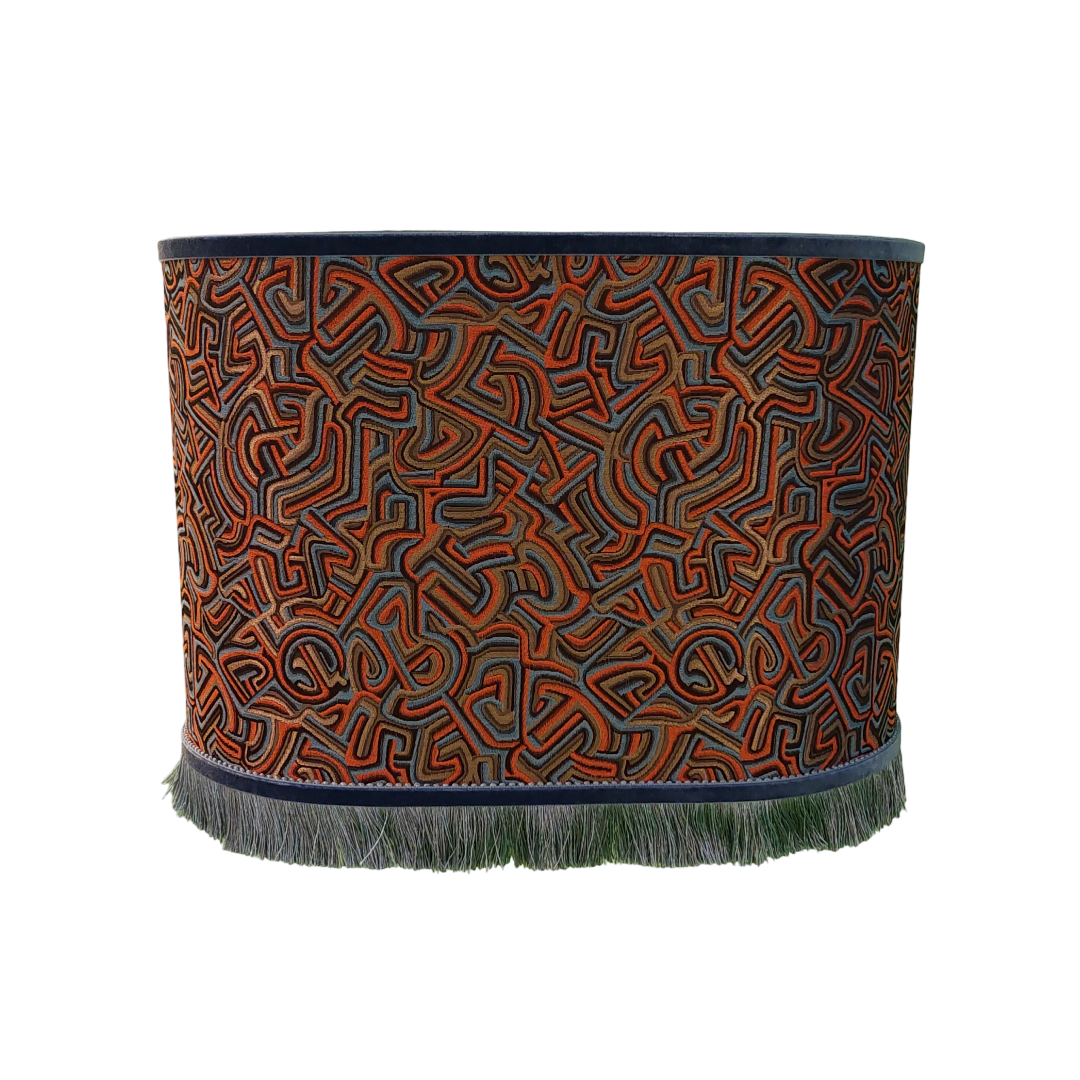 De Pucci lampenkap is een uitnodiging tot een moderne sfeer vol intrige. Het doolhof-achtige patroon in blauw, oranje en camel tinten zorgt voor een rijke en dynamische uitstraling. Afgewerkt met een fraai velours bandje, straalt deze lampenkap karakter uit en vormt in elke kamer een boeiend en luxueus middelpunt.