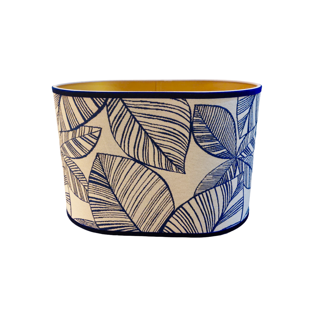 De Turijn lampenkap combineert luxe met een minimalistische en exotische uitstraling. Het design wordt gesierd door een patroon van prachtige blauw omrande bladeren die door elkaar heen lopen. Dit blad motief creëert een verfijnde, tropische sfeer. De kap is luxueus afgewerkt met een blauw fluwelen bandje.